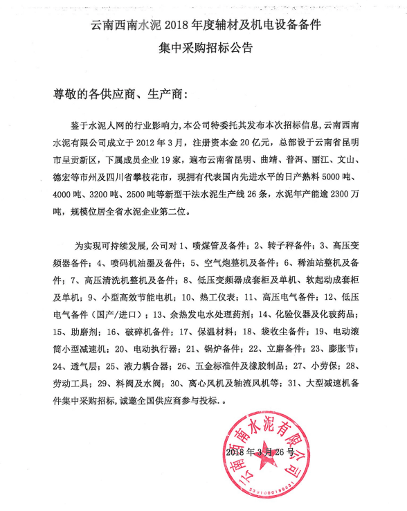 云南西南水泥2018年度輔材及機電設備備件集中采購招標公告