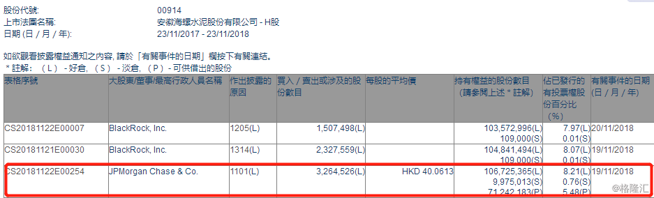 格隆匯獲悉,根據(jù)港交所最新權(quán)益披露資料顯示,2018年11月19日,海螺水泥獲JP Morgan Chase & Co.場內(nèi)以每股均價40.0613港元,增持326.45萬股,總價約1.31億港元。