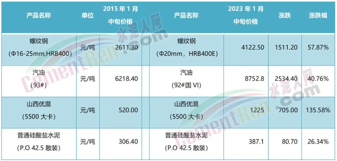 從國(guó)家統(tǒng)計(jì)局?jǐn)?shù)據(jù)可見(jiàn),煤炭漲價(jià),水泥跌價(jià)是近幾年來(lái)的普遍趨勢(shì)。2015年1月中旬至今5500大卡煤炭上漲了705元/噸,漲幅135.58%,而P.O42.5散裝水泥上漲了80.70元/噸,上漲僅26.34%。2015年煤價(jià)是水泥價(jià)格的1.7倍,2023年1月中旬煤炭?jī)r(jià)格是水泥價(jià)格的3.16倍。
