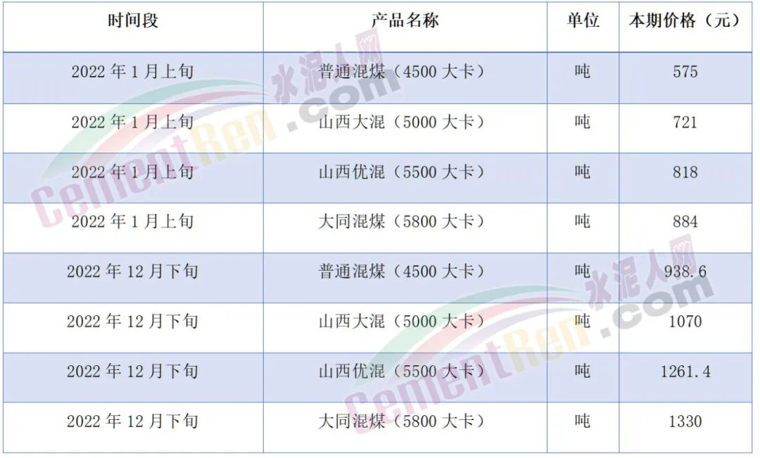 從2022年統(tǒng)計(jì)數(shù)據(jù)來(lái)看2022年1月上旬至12月下旬期間,4500大卡煤炭?jī)r(jià)格上漲了363.6元/噸,漲幅63.23%;5000大卡煤炭?jī)r(jià)格上漲了349元/噸,漲幅48.4%;5500大卡煤炭?jī)r(jià)格上漲了443.4元/噸,漲幅54.2%;5800大卡煤炭?jī)r(jià)格上漲了446元/噸,漲幅50.45%。