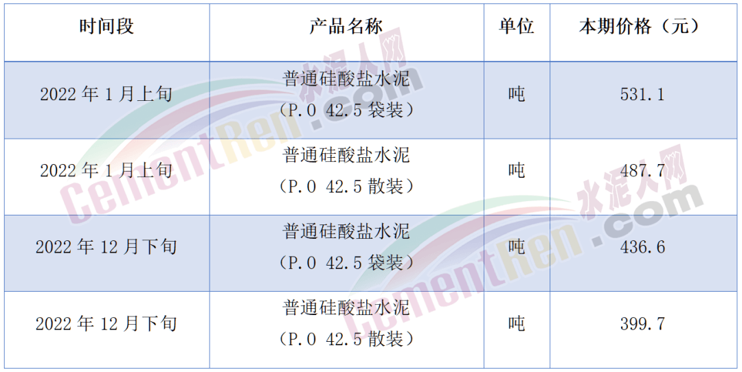 由此可見(jiàn),煤炭的價(jià)格2022年內(nèi)除5000大卡煤炭?jī)r(jià)格漲幅在48.4%外,其他品種煤價(jià)漲幅均超50%。同時(shí)段P.O42.5包裝水泥均價(jià)436.12元/噸,年內(nèi)下跌94.4元/噸,跌幅17.78%;散裝水泥年內(nèi)均價(jià)399.7元/噸,年內(nèi)跌價(jià)88元/噸,跌幅18.04%。煤價(jià)漲了一半以上,水泥價(jià)格卻跌了近20%。