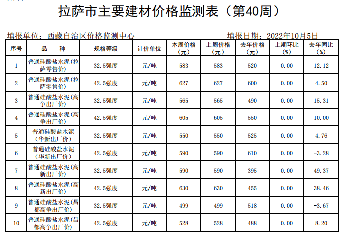 2022年內(nèi)各大水泥企業(yè)多次推漲,以止跌穩(wěn)價(jià),推了一年也沒(méi)能將價(jià)格推到2021年末的水平線(xiàn)。一直處于市場(chǎng)價(jià)格相對(duì)高位的西藏區(qū)域,水泥價(jià)格也一改往年高不可攀的態(tài)勢(shì),一路下跌。西藏發(fā)改委數(shù)據(jù)顯示, 2022年10月初,42.5標(biāo)號(hào)水泥報(bào)價(jià)在528~630元/噸之間。同年1月初42.5標(biāo)號(hào)水泥報(bào)價(jià)在481-570元/噸之間。高低價(jià)差在149元/噸,1月至10月跌幅約在9%左右。與以往年份900元/噸以上的市場(chǎng)價(jià)格相差較大。