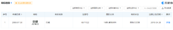 企業知識產權商標信息顯示,企業注冊商標為“巨威”品牌。