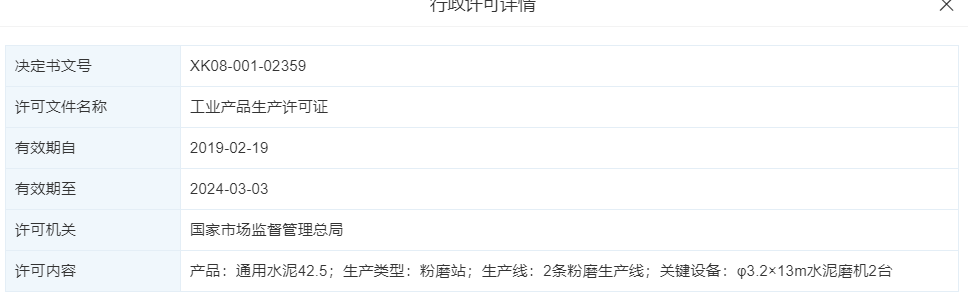 其工業品生產許可證(XK08-001-02359)信息顯示,企業為擁有兩條粉磨生產線的粉磨站,關鍵設備為φ3.2×13m水泥磨機兩臺。