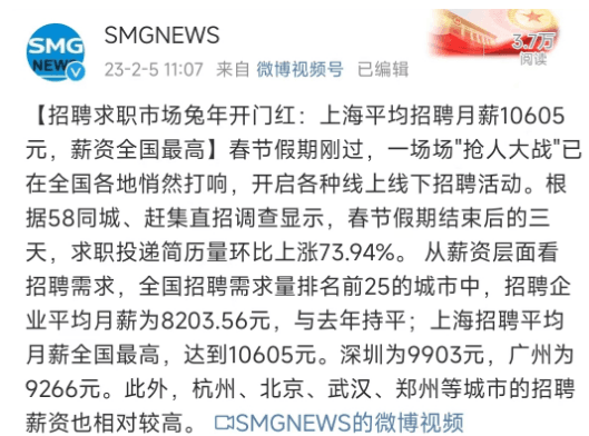 日前,上海廣播電視臺融媒體中心微博號發(fā)布消息稱:春節(jié)假期剛過,一場場“搶人大戰(zhàn)”已在全國各地悄然打響,開啟各種線上線下招聘活動。根據(jù)58同城、趕集直招調查顯示,春節(jié)假期結束后的三天,求職投遞簡歷量環(huán)比上漲73.94%。