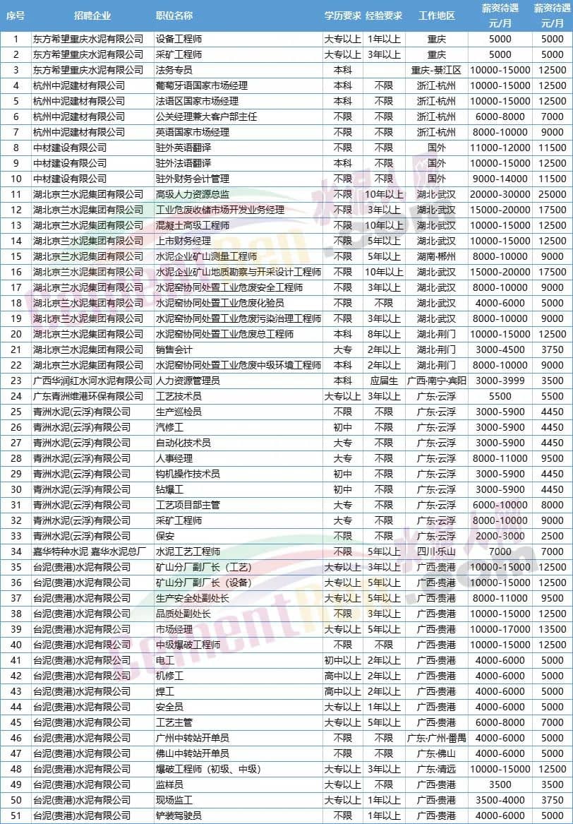 綜合近期發(fā)布招聘信息51條招聘信息可見,月薪最高的是湖北京蘭水泥集團有限公司招聘職位是高級人力資源總監(jiān),要求有10年以上經(jīng)驗,月薪20000-30000元;最低為青洲水泥(云浮)有限公司招聘保安員,月薪2000-3000元;51條招聘信息平均薪資在8691.18元/月;月薪在8000元以下的22條,8000元以上的信息29條。