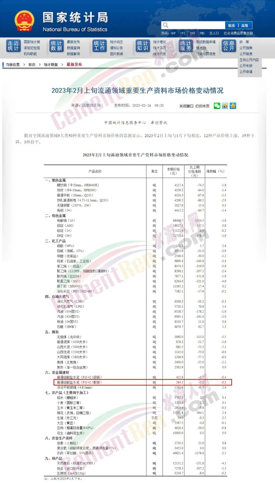 2月14日,國家統計局公布了2023年2月上旬流通領域重要生產資料市場價格變動情況,其中P.O42.5散裝水泥報價384.5元/噸,較1月下旬下跌發1.3元/噸,跌幅0.3%。同比上年2月份470.1元的報價下跌85.6元/噸,跌幅達18.2%。