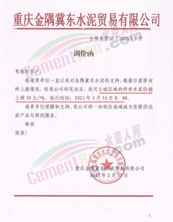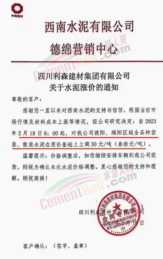 水泥人網通訊員消息,近日 ,西南地區四川、重慶、貴州多地主要品牌企業通知上調水泥價格20-30元/噸。