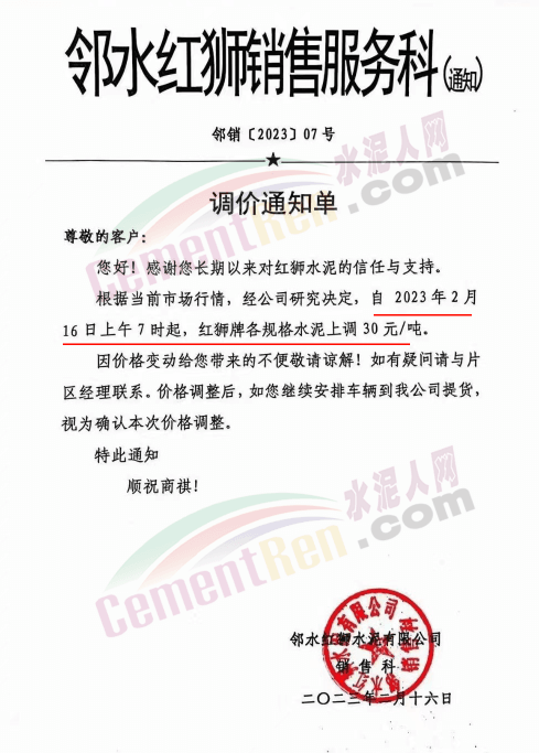 臺泥(英德)公司通知針對廣東省全區域熟料價格自2月9日起上調10元/噸;深圳、東莞、惠州、廣州東各標號散裝水泥上調10元/噸,散裝水泥中轉庫交貨同步上調。
