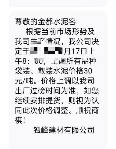 水泥人網通訊員消息,日前獨峰建材有限公司通知,根據當前市場形勢及公司生產情況決定于17日上午8時起,上調所有品種袋裝、散裝水泥價格30元/噸。經銷商提醒“18號還要漲價,這情況少見,想存貨得趕緊了”。