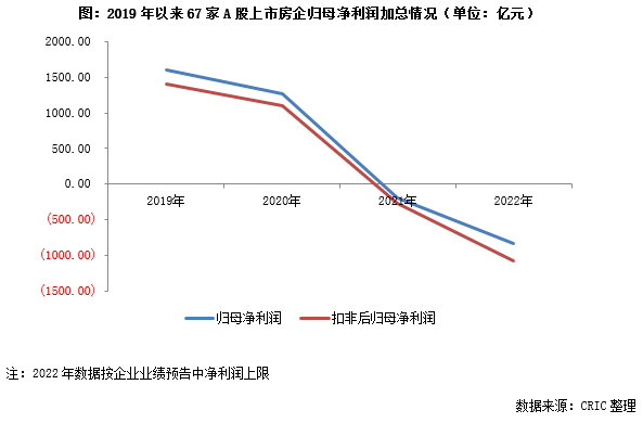 按上述67家房企預計的凈利潤上限計算的話,這些企業的歸母凈利潤總虧損839億元,扣非歸母凈利潤總虧損1073億元(下限1439億元),虧損規模同比大幅增加。