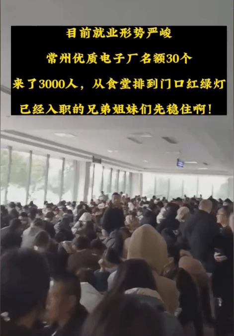 江蘇常州優質電子廠,招工名額30個,來了3000人,從食堂排到門口紅綠燈。