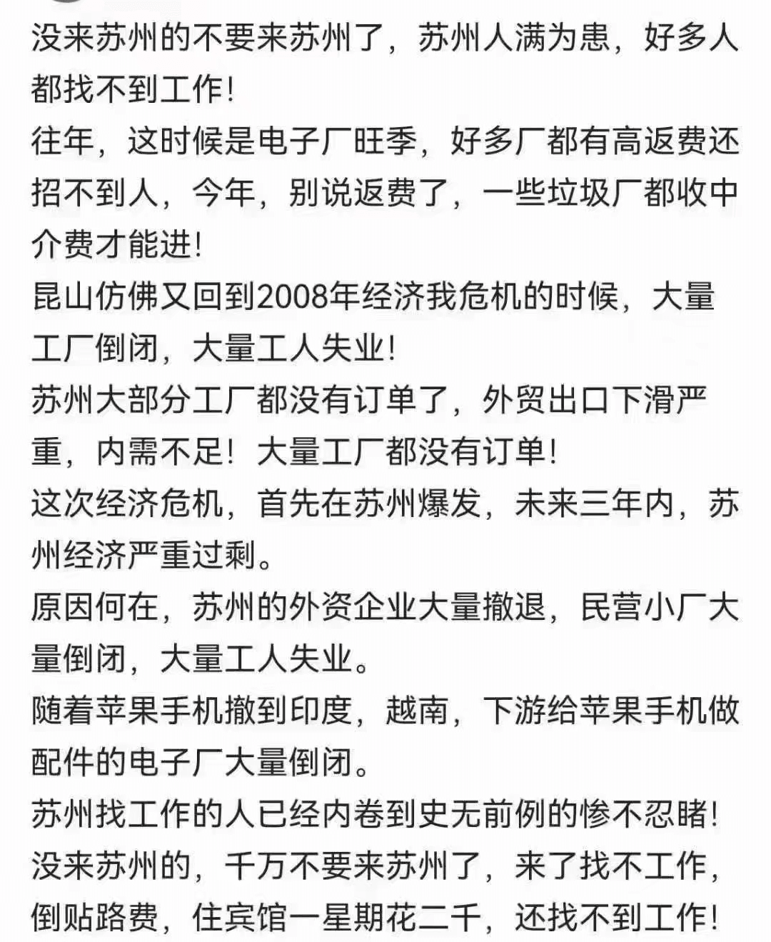 長沙比亞迪全部停招,蘋果昌碩科技暫停招募代工,蘇州立訊已經停招,成都5大工廠(富士康、京東方、仁寶、偉創、捷普)基本都已“熄火”,目前現在廠里都飽和了,要十幾個人,都能去一百多人。