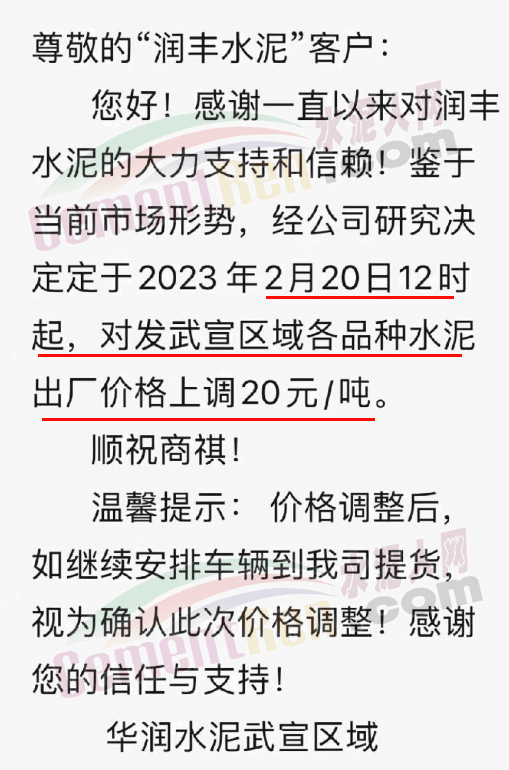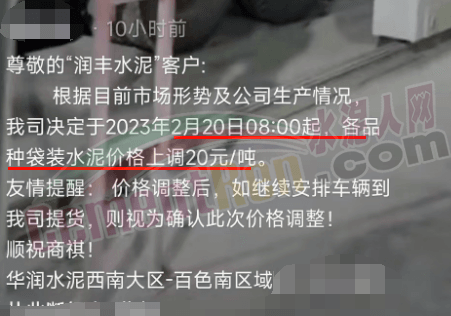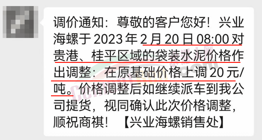 海螺水泥通知,于2月20日0時起,對廣西區域全品項水泥價格上調20元/噸。并提示,價格調整后,若繼續安排車輛提貨,視為確認此次價格調整。