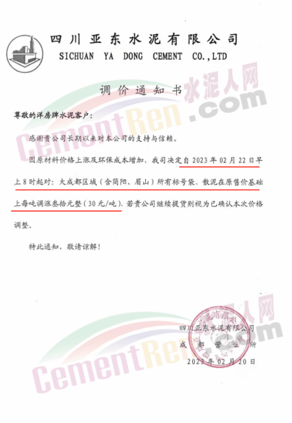 同期,四川蘭豐水泥、亞東水泥分別通知,2月22日早8時起,大成都區域所有標號水泥上調30元/噸。