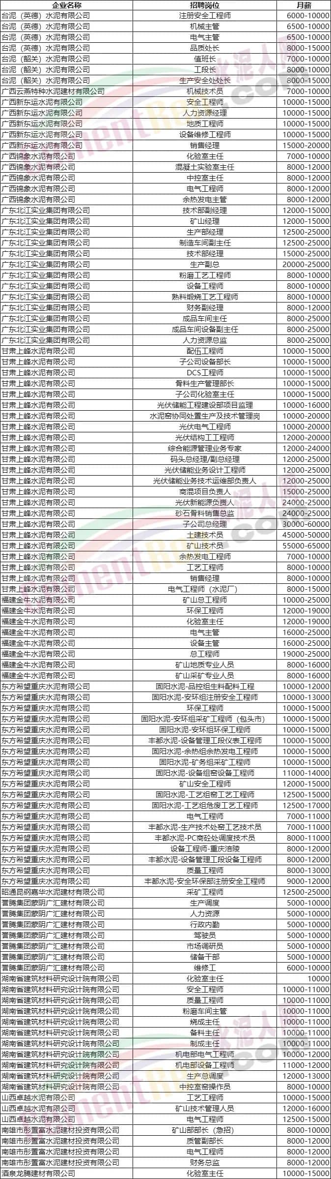 水泥人網(wǎng)通訊員消息:近期水泥行業(yè)投簡歷找工作的人多了起來,發(fā)招聘啟事的企業(yè)卻不太多了,薪資高的崗位的更是少見了。水泥人網(wǎng)信息平臺也收到許多求職簡歷,希望幫忙介紹水泥廠相關(guān)崗位。水泥人網(wǎng)特將近期發(fā)布招聘啟事,且月薪在萬元以上的招聘信息綜合如下: