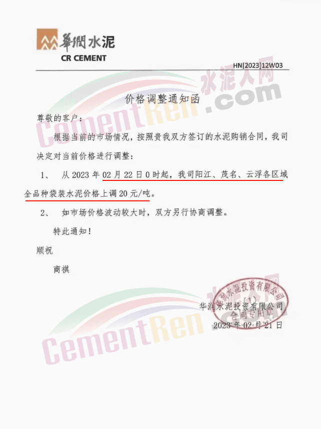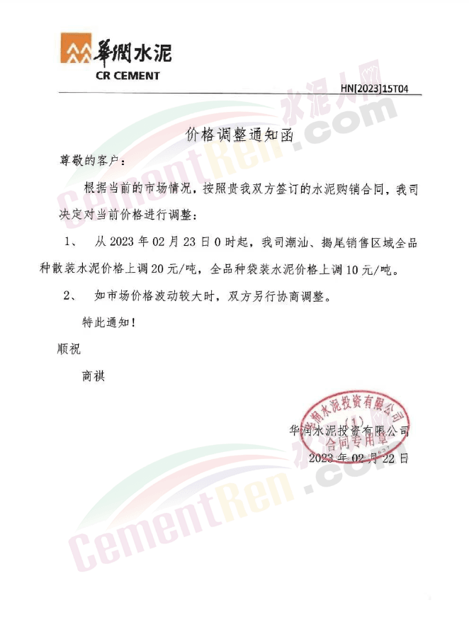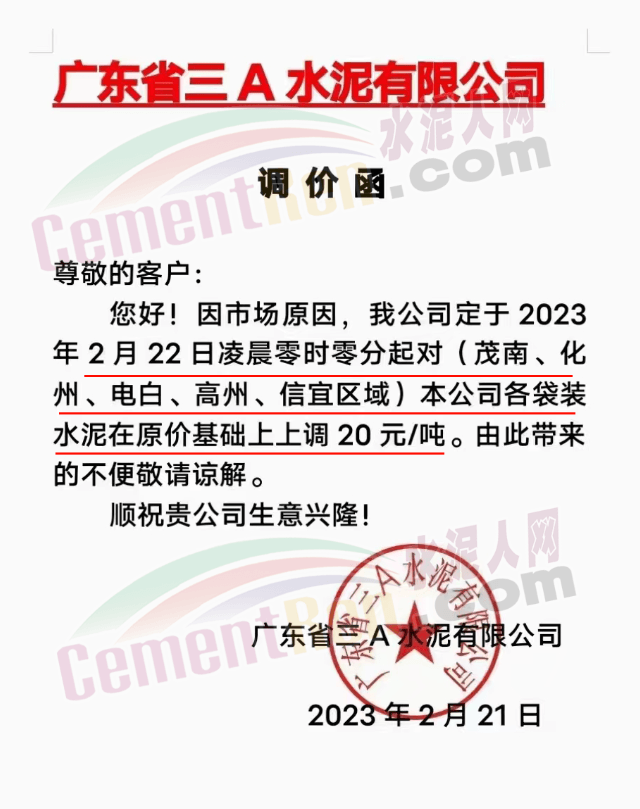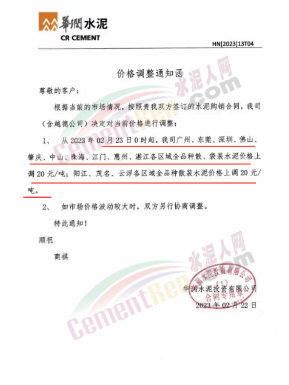 華潤水泥通知從2023年2月23日0時起,廣州、東莞、深圳、佛山、肇慶、中山、珠海、江門、惠州、湛江各區(qū)域全品種散、袋裝水泥價格上調(diào)20元/噸;陽江、茂名、云浮各區(qū)域全品種散裝水泥價格上調(diào)20元/噸;潮汕、揭尾銷售區(qū)域全品種散裝水泥價格上調(diào)20元/噸,全品種袋裝水泥價格上調(diào)10元/噸。