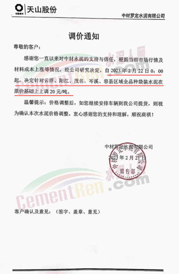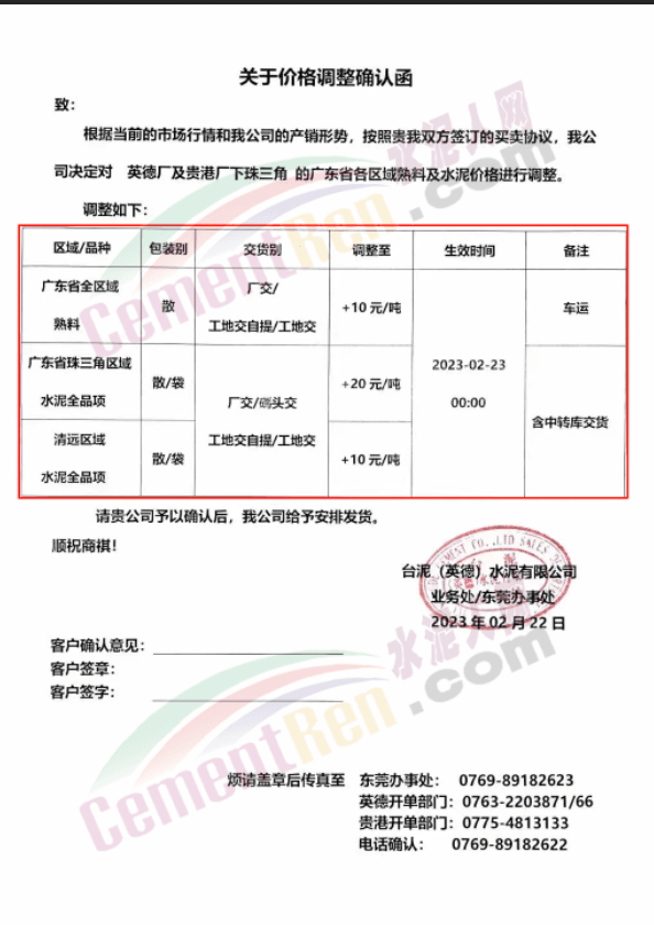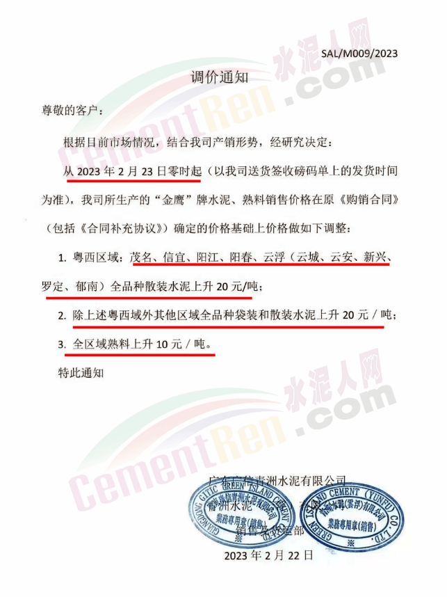 從2023年2月23日零時起所生產(chǎn)的“金鷹”牌水泥、熟料銷售價格在原《購銷合同)(包括《合同補(bǔ)充協(xié)議》)確定的價格基礎(chǔ)上價格做調(diào)整。粵西區(qū)域:茂名、信宜、陽江、陽春、云浮(云城、云安、新興、羅定、郁南)全品種散裝水泥上升20元/噸;除上述粵西域外其他區(qū)域全品種袋裝和散裝水泥上升20元/噸;全區(qū)域熟料上升10元/噸。