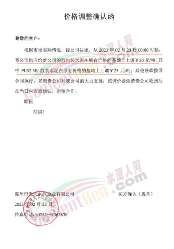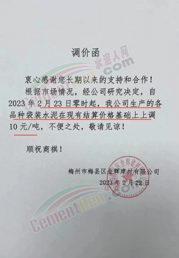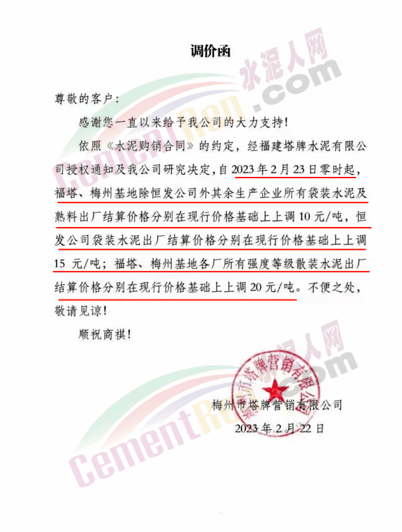 梅州市塔牌營銷有限公司通知,經(jīng)福建塔牌水泥有限公司授權(quán)通知及公司研究決定,自2023年2月23日零時起福塔、梅州基地除恒發(fā)公司外其余生產(chǎn)企業(yè)所有袋裝水泥及熟料出廠結(jié)算價格分別在現(xiàn)行價格基礎(chǔ)上上調(diào)10元/噸,恒發(fā)公司袋裝水泥出廠結(jié)算價格分別在現(xiàn)行價格基礎(chǔ)上上調(diào)15元/噸;福塔、梅州基地各廠所有強(qiáng)度等級散裝水泥出廠結(jié)算價格分別在現(xiàn)行價格基礎(chǔ)上上調(diào)20元/噸。