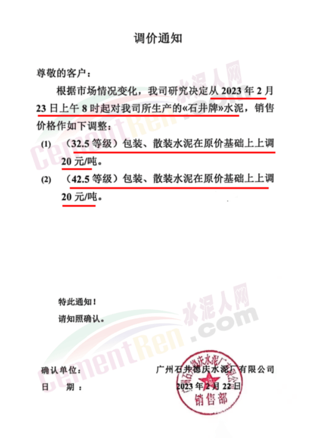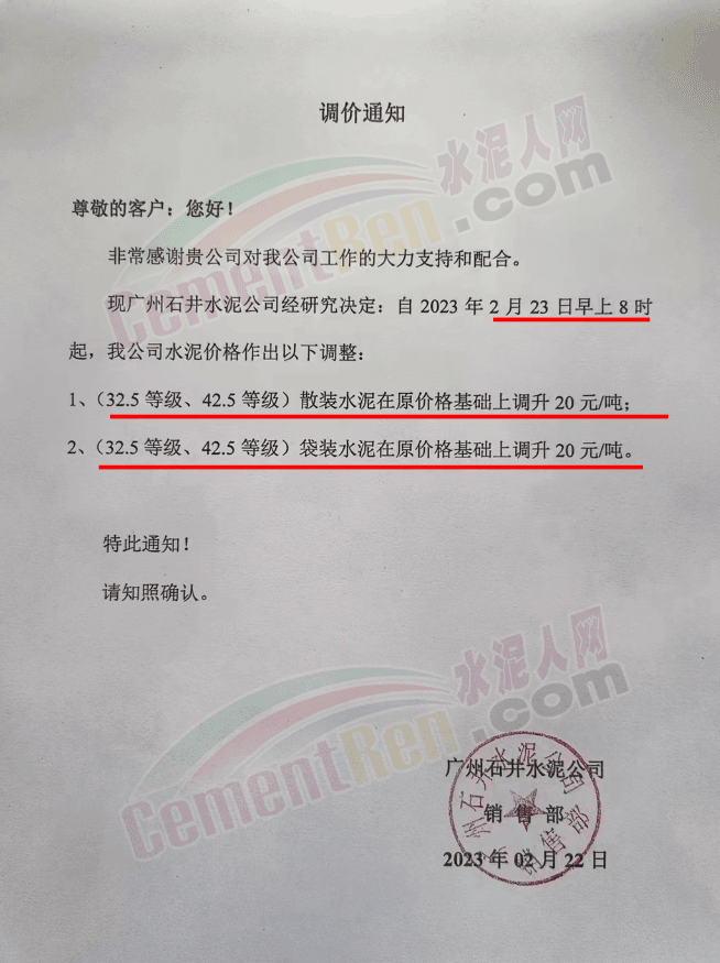 廣州石井水泥、石井德慶水泥通知從2023年2月23日上午8時起,水泥價格上調(diào)20元/噸。