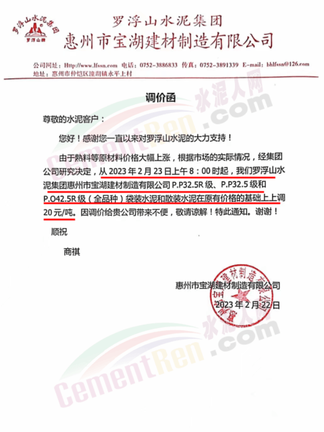 羅浮山水泥集團(tuán)惠州市寶湖建材制造有限公司通知,由于熟料等原材料價格大幅上漲,根據(jù)市場的實(shí)際情況,經(jīng)集團(tuán)公司研究決定,從2023年2月23日上午8:00時起,羅浮山水泥集團(tuán)惠州市寶湖建材制造有限公司PP325R級PP325級和P.042.5R級(全品種)袋裝水泥和散裝水泥在原有價格的基礎(chǔ)上上調(diào)20元/噸。