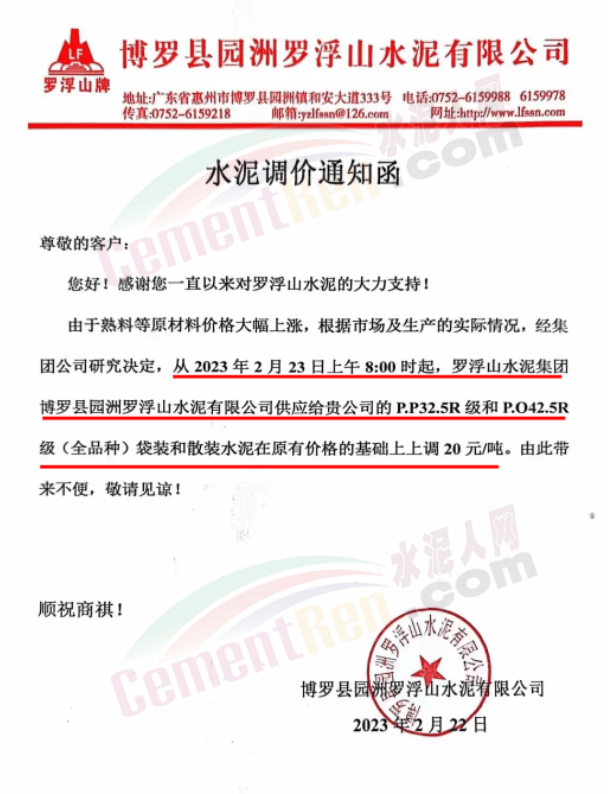 博羅縣園洲羅浮山水泥有限公司通知,由于熟料等原材料價格大幅上漲,根據(jù)市場及生產(chǎn)的實(shí)際情況,經(jīng)集團(tuán)公司研究決定,從2023年2月23日上午8:00時起,羅浮山水泥集團(tuán)博羅縣園洲羅浮山水泥有限公司PP325R級和P425R級(全品種)袋裝和散裝水泥在原有價格的基礎(chǔ)上上調(diào)20元/噸。