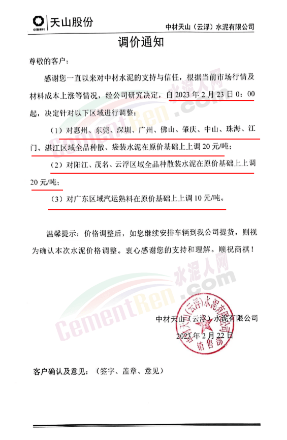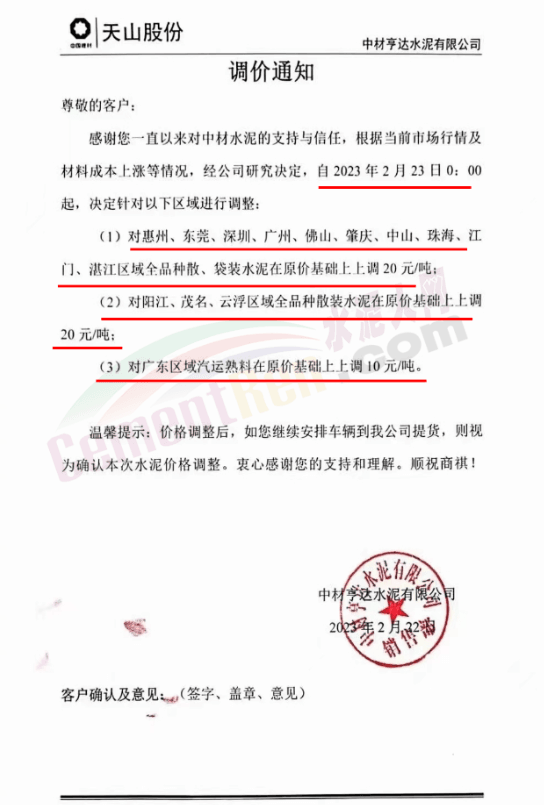 中材亨達(dá)水泥有限公司通知,根據(jù)當(dāng)前市場行情及材料成本上漲等情況,經(jīng)公司研究決定,自2023年2月23日0時起: 對惠州、東莞、深圳、廣州、佛山、肇慶、中山、珠海、江門、湛江區(qū)域全品種散、袋裝水泥在原價基礎(chǔ)上上調(diào) 20 元/噸;對陽江、茂名、云浮區(qū)域全品種散裝水泥在原價基礎(chǔ)上上調(diào)20 元/噸;對廣東區(qū)域汽運(yùn)熟料在原價基礎(chǔ)上上調(diào)10元/噸。