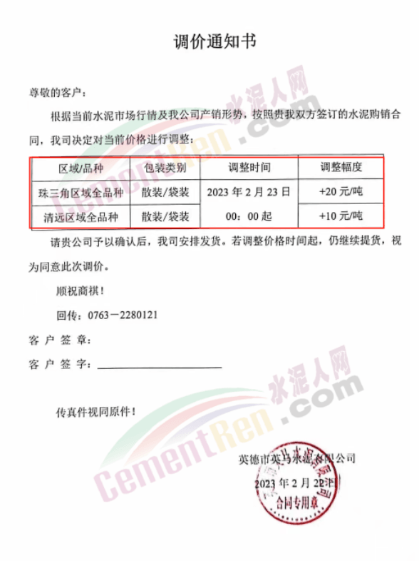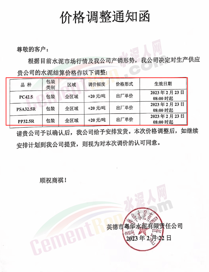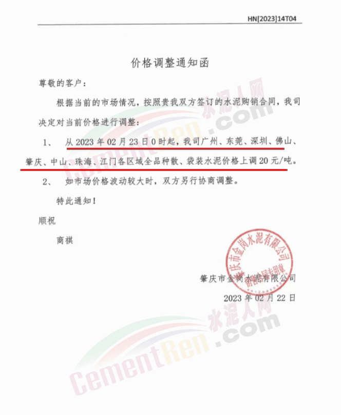 肇慶金崗水泥通知,從2023年02月23日0時起,公司廣州、東莞、深圳、佛山肇慶、中山、珠海、江門各區(qū)域全品種散、袋裝水泥價格上調(diào)20 元/噸。