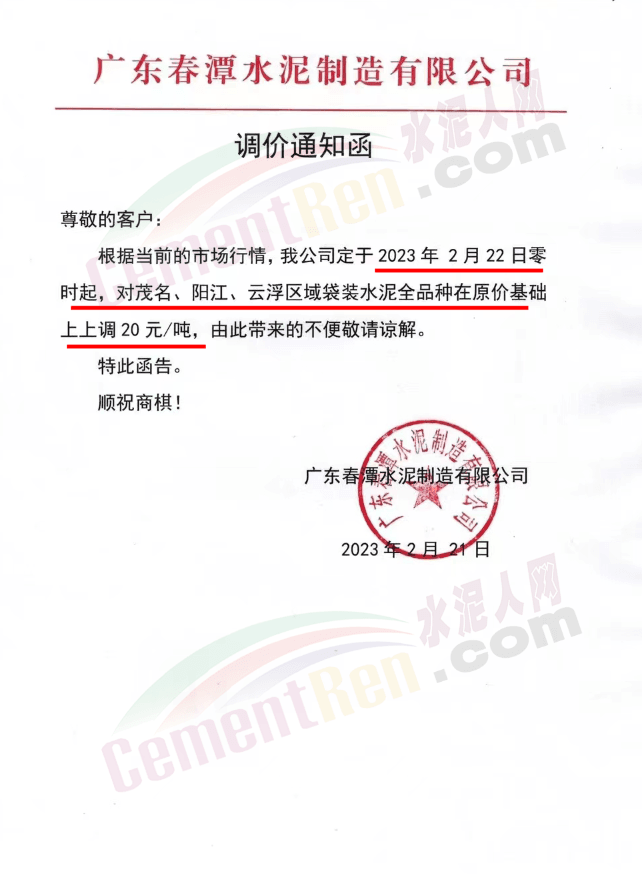 廣東春潭水泥制造有限公司通知,公司定于2023年2月22日零時起,對茂名、陽江、云浮區(qū)域袋裝水泥全品種在原價基礎(chǔ)上上調(diào)20元/噸。