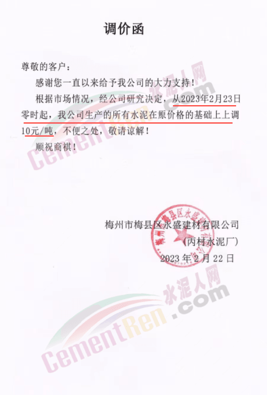 梅州市梅縣區(qū)永盛建材有限公司通知,2月23日零時起,所有水泥上調(diào)10元/噸。