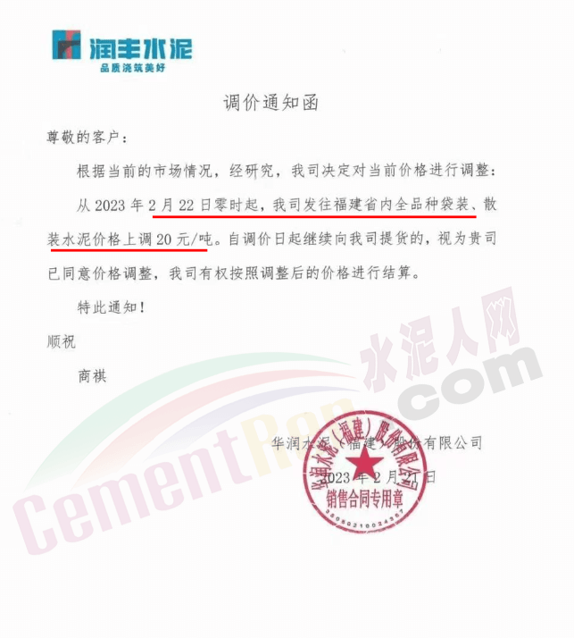 華潤水泥通知2月22日零時起,公司發(fā)往福建省水泥價格上調(diào)20元/噸。