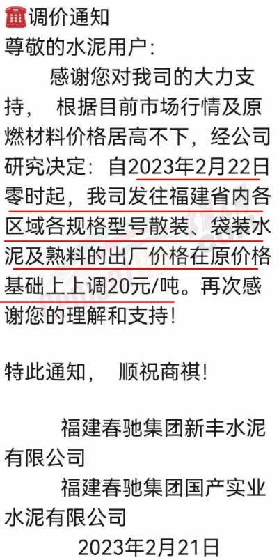 福建春馳通知2月22日零時起,發(fā)往福建省區(qū)域各規(guī)格水泥及熟料出廠價格上調(diào)20元/噸。