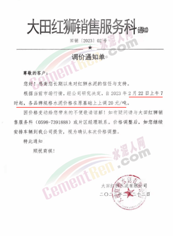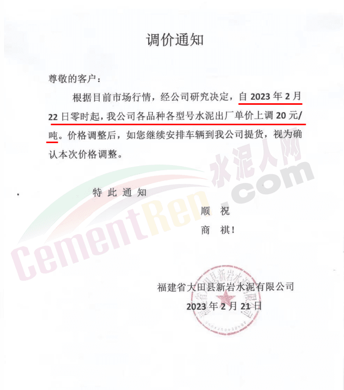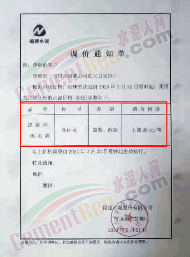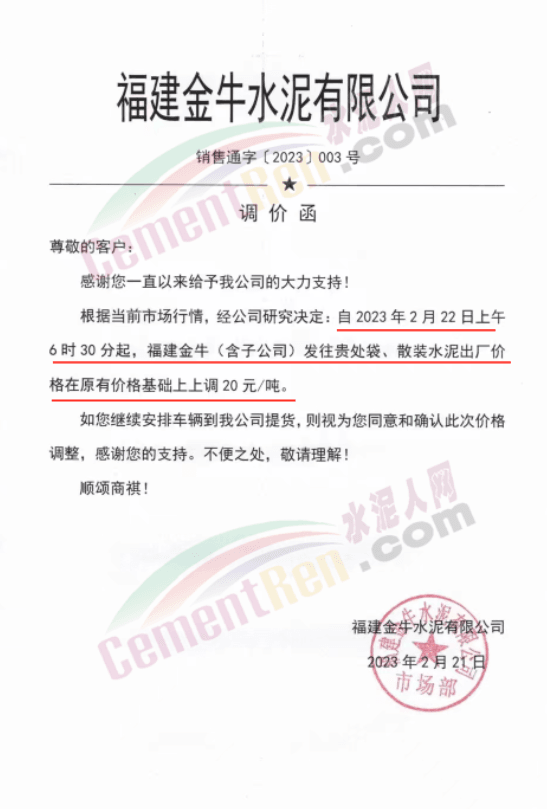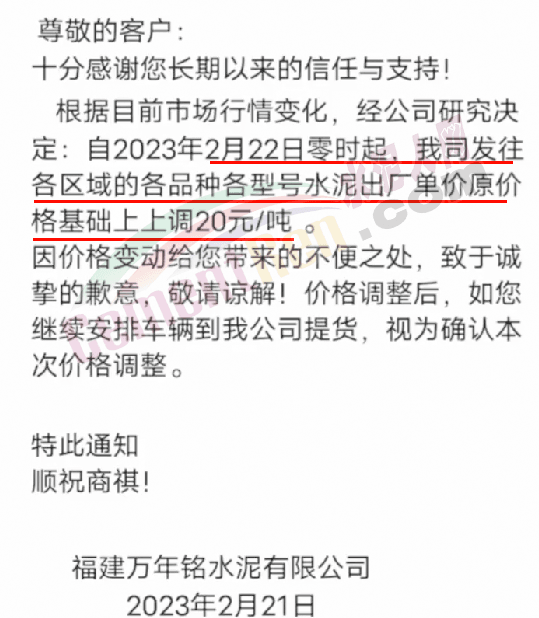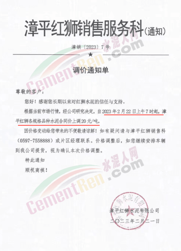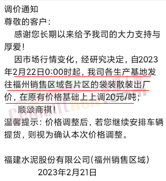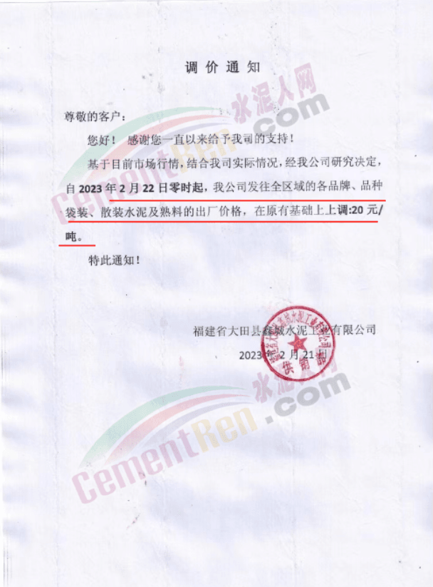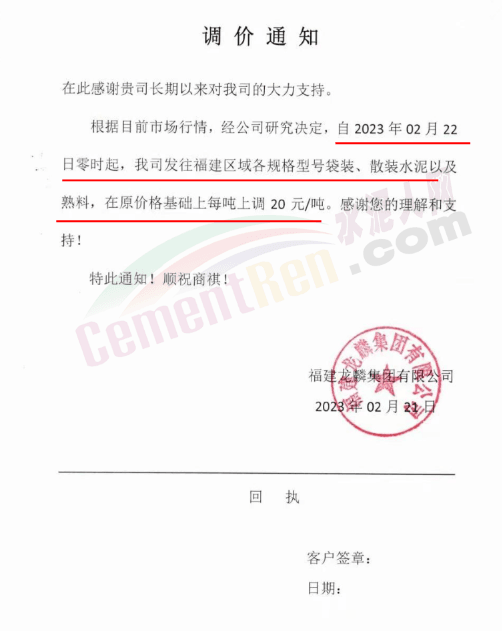 福建龍麟集團(tuán)通知自2023年2月22日零時起,公司發(fā)往福建區(qū)域各規(guī)格型號袋裝、散裝水泥以及熟料,在原價格基礎(chǔ)上每噸上調(diào)20元/噸。