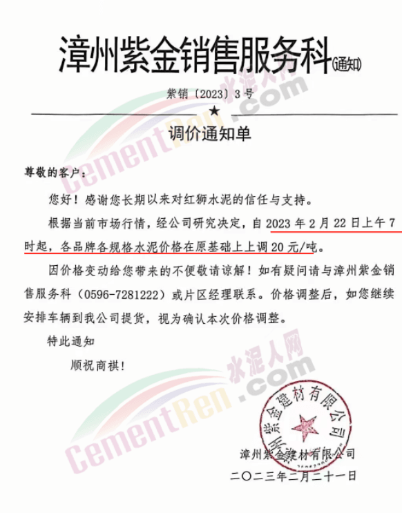 漳州紫金銷售服務(wù)科通知2月22日上午7時起,上調(diào)水泥價格20元/噸。