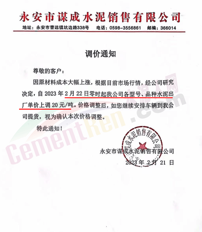 永安市謀成永泥銷售有限公司通知,自2023年2月22日零時起公司各型號、品種水泥出廠單價上調(diào)20元/噸。