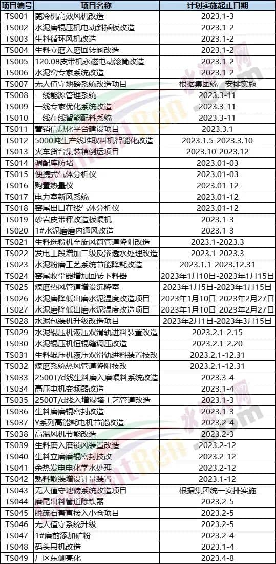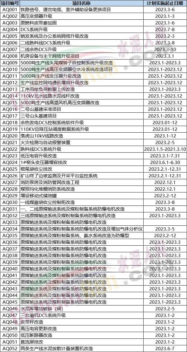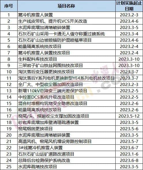 安全類項(xiàng)目涉及變頻器升級(jí)、皮帶廊加固、頭尾煤轉(zhuǎn)子秤控制系統(tǒng)、變頻器水冷系統(tǒng)、安全監(jiān)控網(wǎng)絡(luò)系統(tǒng)、高溫風(fēng)機(jī)改造、火災(zāi)檢測(cè)與自動(dòng)報(bào)警裝置、窯尾收塵器技改、煤粉制備防爆系統(tǒng)、原煤輸送系統(tǒng)及煤粉制備系統(tǒng)防爆電機(jī)改造、篦冷機(jī)推雪人裝置、生產(chǎn)線皮帶機(jī)、提升機(jī)VCS開關(guān)改造、水泥庫底增加清堵破碎裝置、石灰石礦山采用一卡通無人值守稱重過磅系統(tǒng)、石灰石礦山邊坡噴錨防護(hù)混噴植草項(xiàng)目、能量隔離系統(tǒng)技改項(xiàng)目、生料配料庫技改項(xiàng)目、淘汰落后變壓器更換技改項(xiàng)目、全廠大、中型收塵器加固改造項(xiàng)目、中控室DCS系統(tǒng)升級(jí)改造項(xiàng)目改造項(xiàng)目、混合材堆棚構(gòu)筑物安全隱患改造項(xiàng)目、水泥庫底增加清堵破碎裝置、高溫風(fēng)機(jī)、窯尾風(fēng)機(jī)增設(shè)旁路控制項(xiàng)目、石灰石礦山運(yùn)礦道路改道項(xiàng)目、總降后臺(tái)檢測(cè)保護(hù)系統(tǒng)改造、水泥庫疏堵技改項(xiàng)目以及礦山基建項(xiàng)目等。