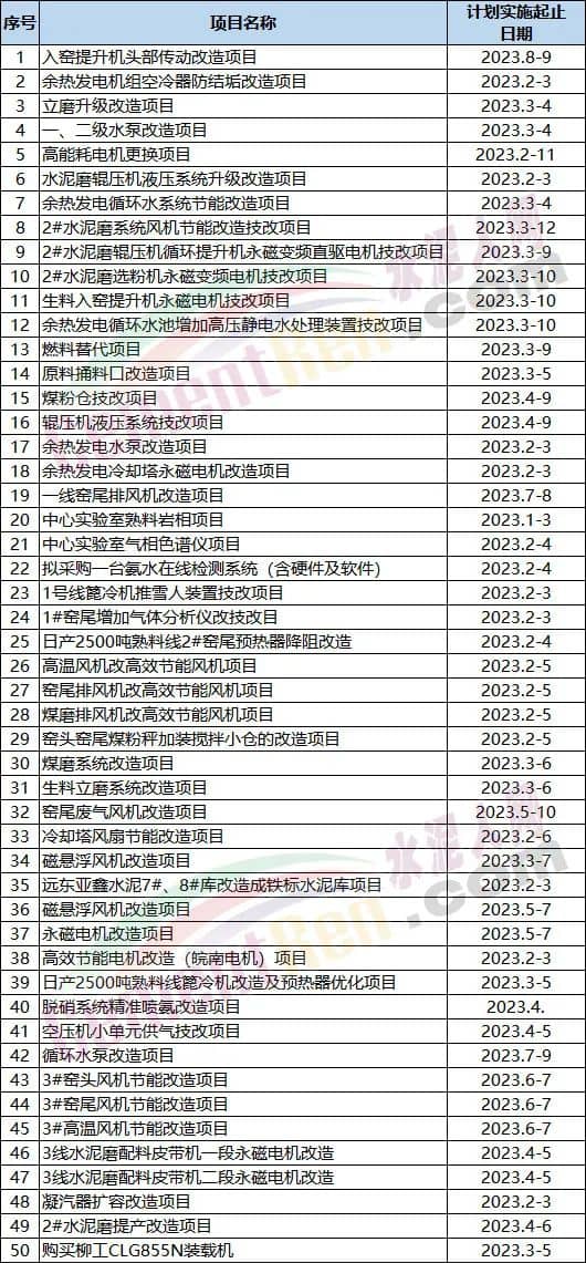 環(huán)保類技改項(xiàng)目涉及低壓收塵環(huán)保改造、精準(zhǔn)SNCR脫硝、脫硝系統(tǒng)升級(jí)改造、無組織超低排放改造 、高耗能電機(jī)淘汰、粉磨系統(tǒng)技改、替代燃料技改、綠色礦山建設(shè)以及堆場(chǎng)降塵、破碎機(jī)揚(yáng)塵治理、粉塵治理、循環(huán)水再利用、脫硫改造、氯水罐拆建、配料皮帶揚(yáng)塵治理、提升機(jī)改造、V選冷風(fēng)機(jī)改造、皮帶廊全封閉、篦冷機(jī)隔音降噪改造、大棚翻新、地面硬化、煙氣在線監(jiān)測(cè)系統(tǒng)、原煤及煤均化棚造霧降塵系統(tǒng)、礦山取水噴淋項(xiàng)目、礦生態(tài)修復(fù)治理項(xiàng)目等。