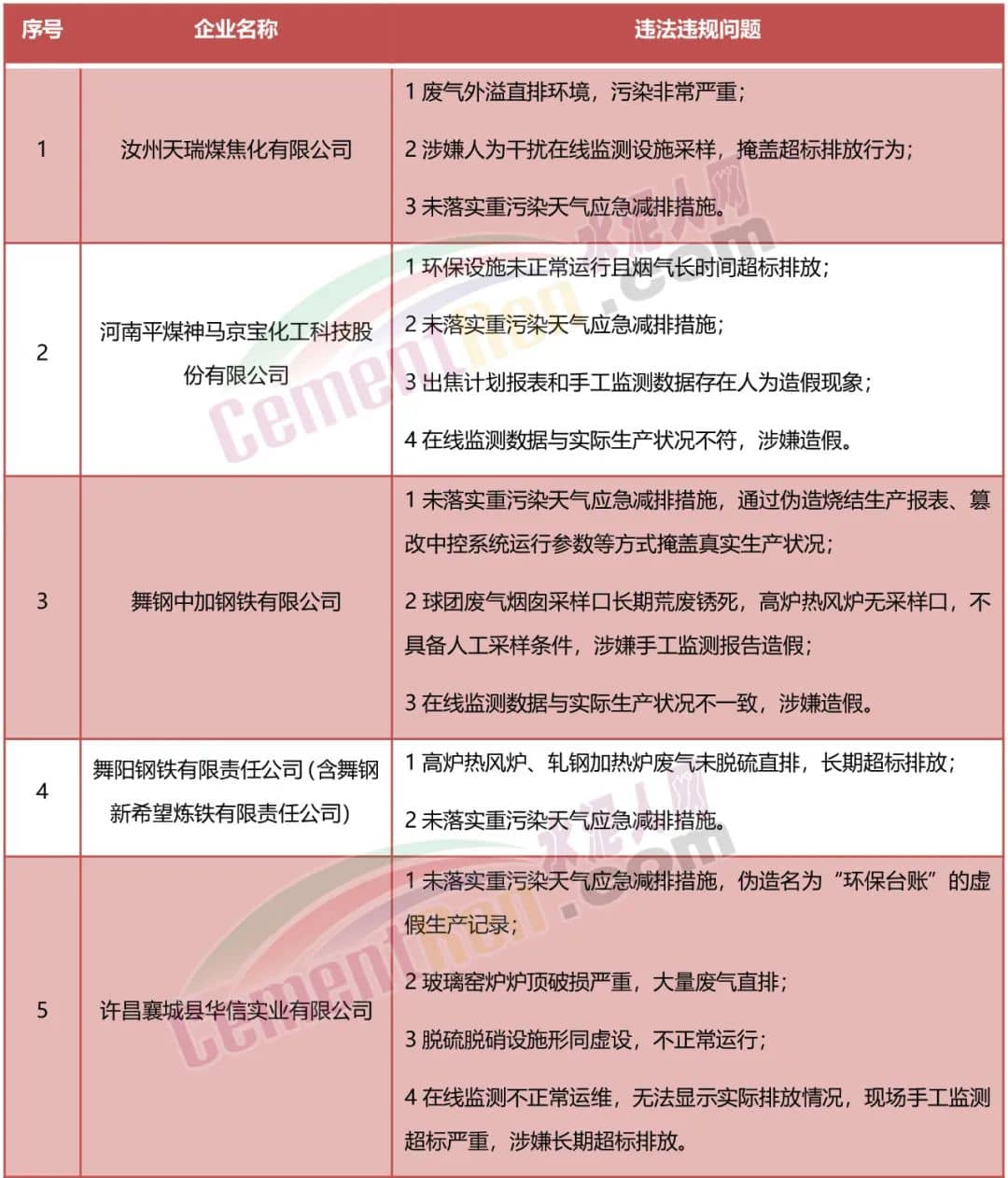 據(jù)水泥人網(wǎng)了解,除上述水泥企業(yè)外,今年河北、江蘇、海南、安徽多地生態(tài)環(huán)境部門通報(bào)了多起涉及水泥、混凝土企業(yè)違反大氣污染防治法及存在環(huán)境違法案例。