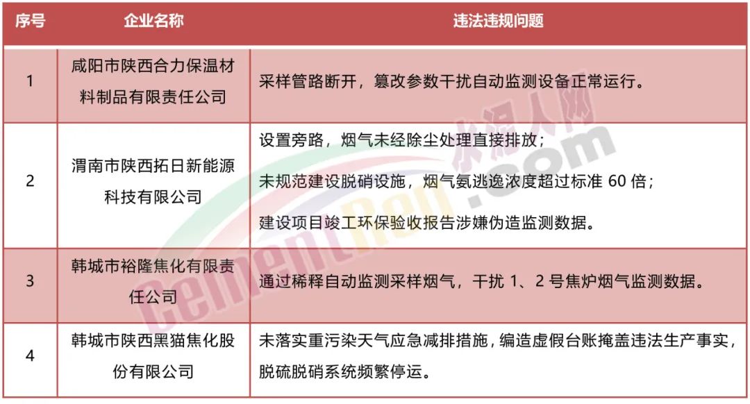 2月21日~22日,生態(tài)環(huán)境部副部長趙英民帶隊(duì)赴陜西省咸陽市、渭南市和韓城市等空氣質(zhì)量明顯反彈城市監(jiān)督幫扶,對(duì)涉氣重點(diǎn)企業(yè)開展“四不兩直”督導(dǎo)檢查發(fā)現(xiàn)4家企業(yè)問題突出:
