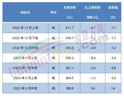P.O42.5散裝水泥不足400元/噸的報價,從上年12月下旬至今已經持續了5個統計周期。且從2022年12月上旬起一直連續6個統計周期下跌,直至今年2月中旬才見反彈上行。