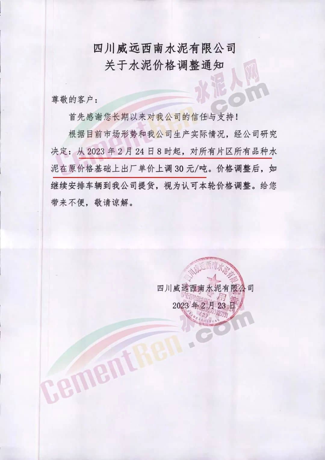 四川威遠西南水泥有限公司通知,根據目前市場形勢和公司生產實際情況,經公司研究決定從2023年2月24日8時起,對所有片區所有品種水泥在原價格基礎上出廠單價上調 30 元/噸。