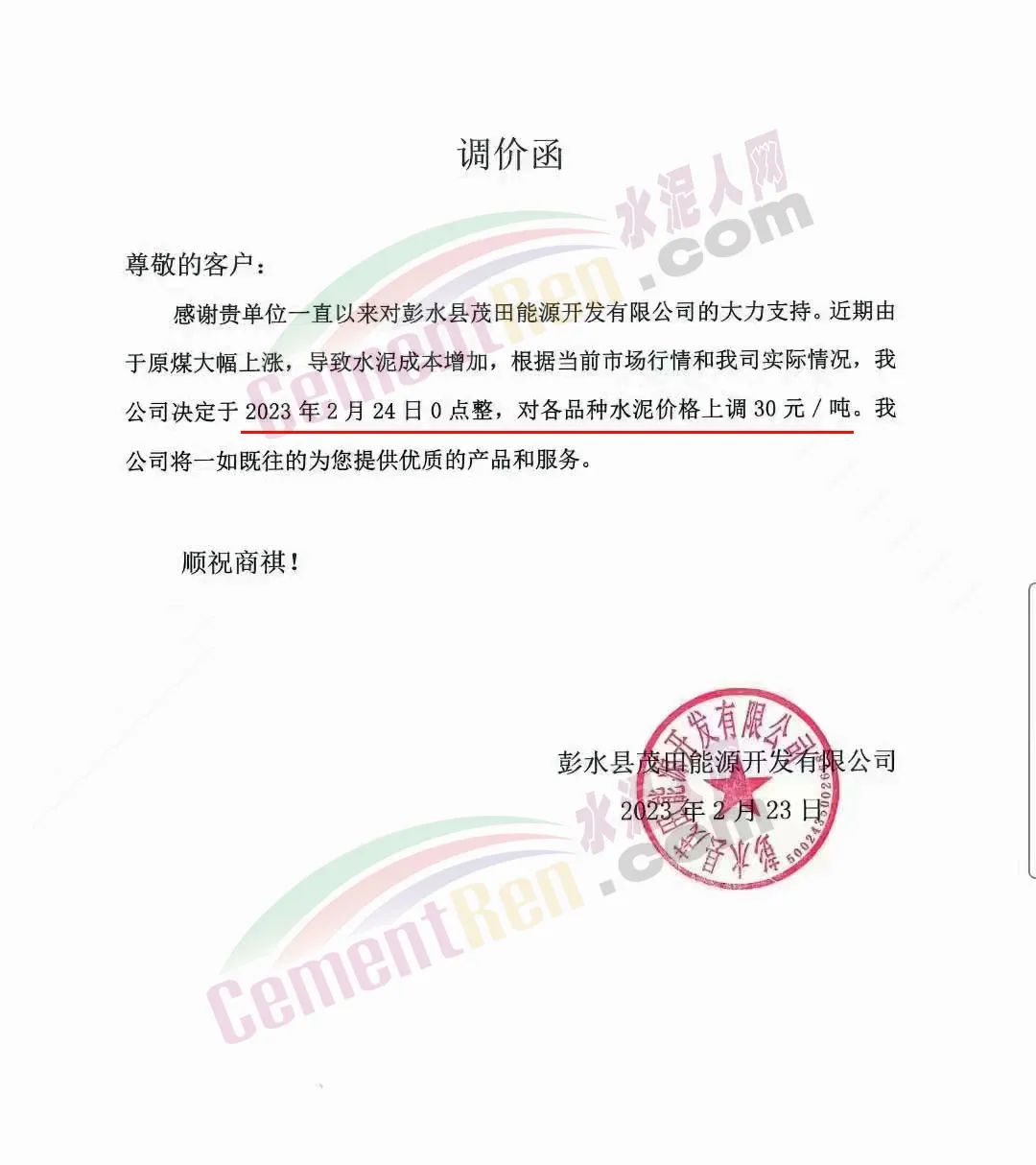 彭水縣茂田能源開發有限公司通知,近期由于原煤大幅上漲,導致水泥成本增加,根據當前市場行情和我司實際情況,定于2023年2月24日0點整,對各品種水泥價格上調30元/噸。