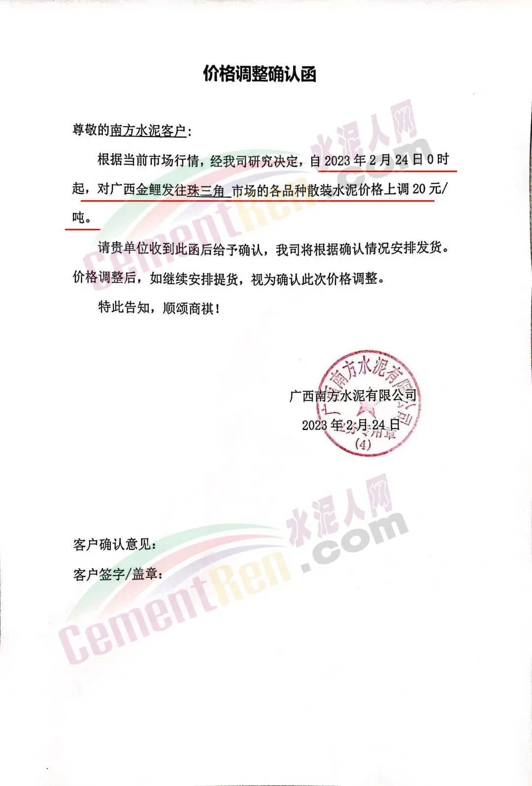 廣西南方水泥有限公司通知,經公司研究決定,自2023年2月24日0時起,對廣西金鯉發往珠三角市場的各品種散裝水泥價格上調20元/噸。