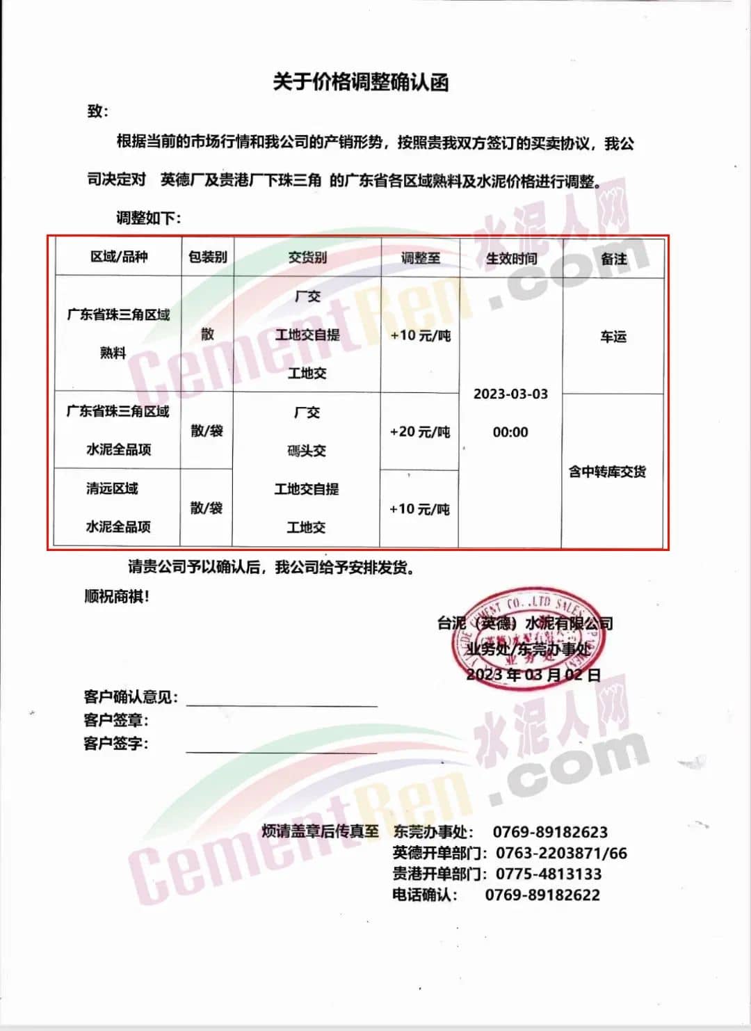 臺泥(英德)水泥有限公司通知,根據當前的市場行情和公司產銷形勢,決定自3月3日0時起對英德廠及貴港廠下珠三角的廣東省各區域熟料價格上調10元/噸,廣東省珠三角區域全品項水泥上調20元/噸,清遠區域上調10元/噸。