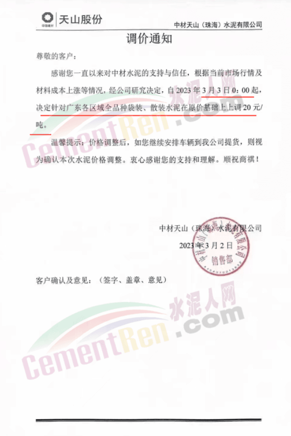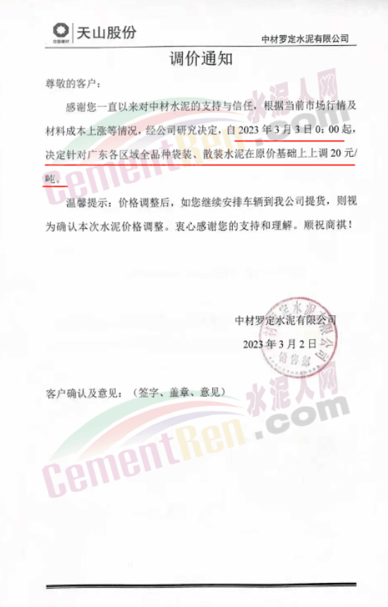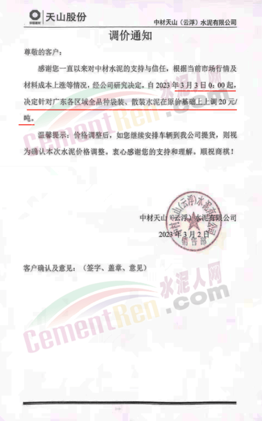 中材天山(云浮)水泥通知,根據當前市場行情及材料成本上漲等情況,經公司研究決定,自3月3日0時起對廣東各區域全品種袋裝、散裝水泥在原價基礎上上調20元/噸。