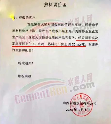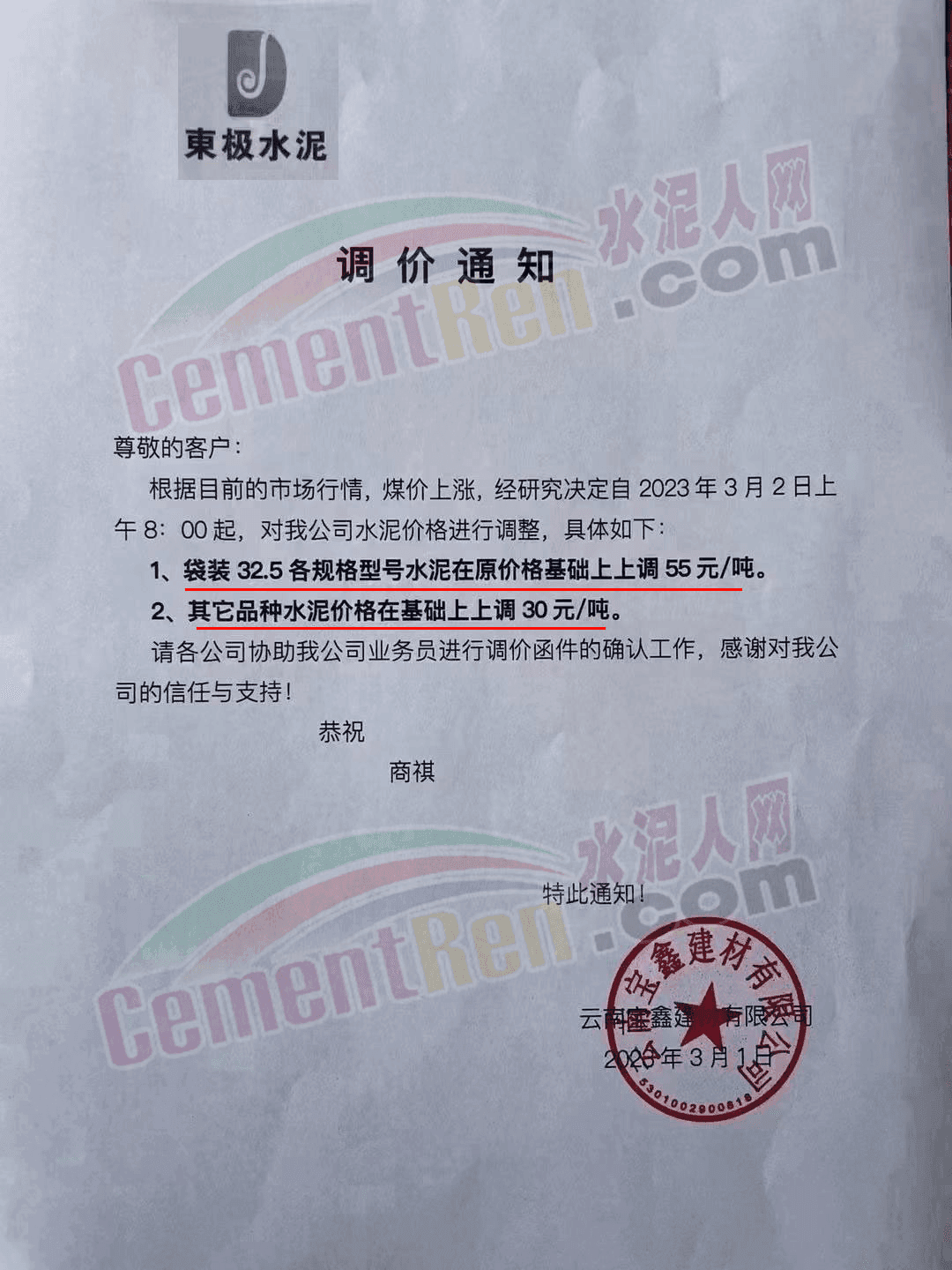 東莞市國鉅建材有限公司通知,根據市場行情及各種原材料價格持續上漲,經公司研究決定從2023年3月4日早上8時起,公司生產的所有品種水泥在原有價格的基礎上上調20元/噸。