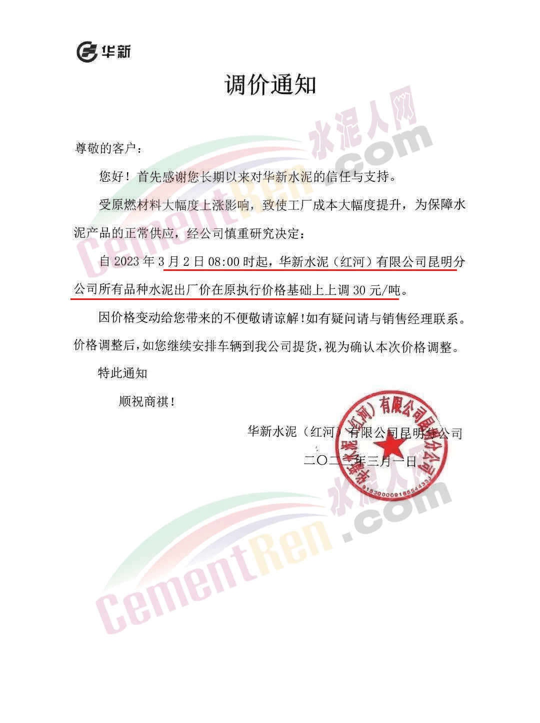 華新水泥紅河公司昆明分公司通知,受原燃材料大幅度上漲影響,致使工廠成本大幅度提升,為保障水泥產品的正常供應,經公司慎重研究決定,2023年3月2日8時起,華新水泥(紅河)有限公司昆明分公司所有品種水泥出廠價在原執行價格基礎上上調30元/噸。
