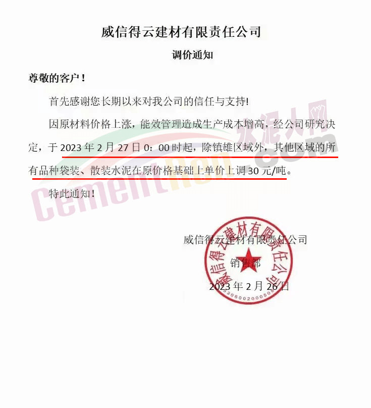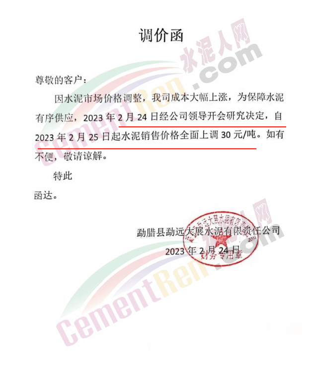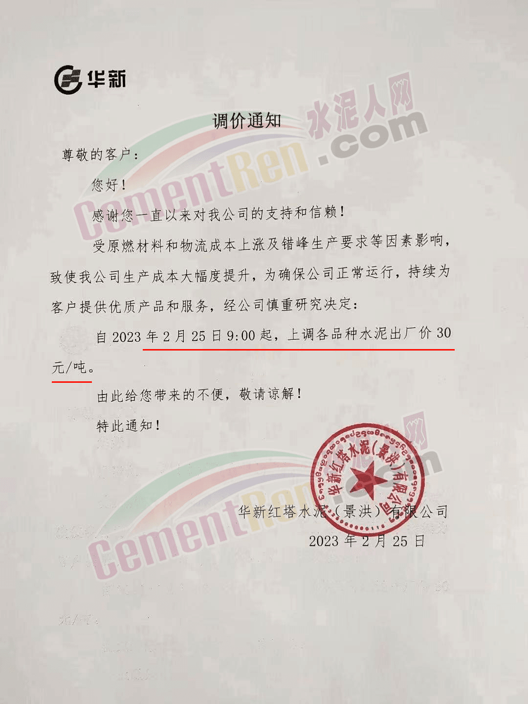 云南普洱天恒水泥有限責任公司通知,由于近期原材料價格上漲、環保成本持續增加,導致公司生產成本增長。為確保公司生產正常運行,經公司研究決定,自2023年2月25日0時起,對全區域全品種水泥出廠價格上調30元/噸。