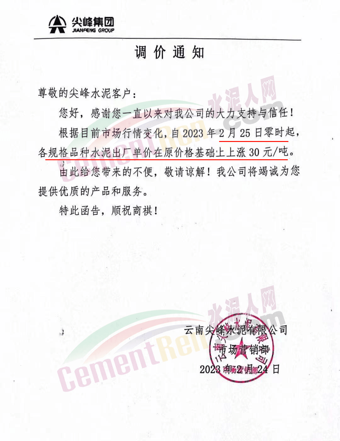 云南尖峰水泥通知自2023年2月25日零時起各規格品種水泥出廠價在原價格基礎上上漲30元/噸。