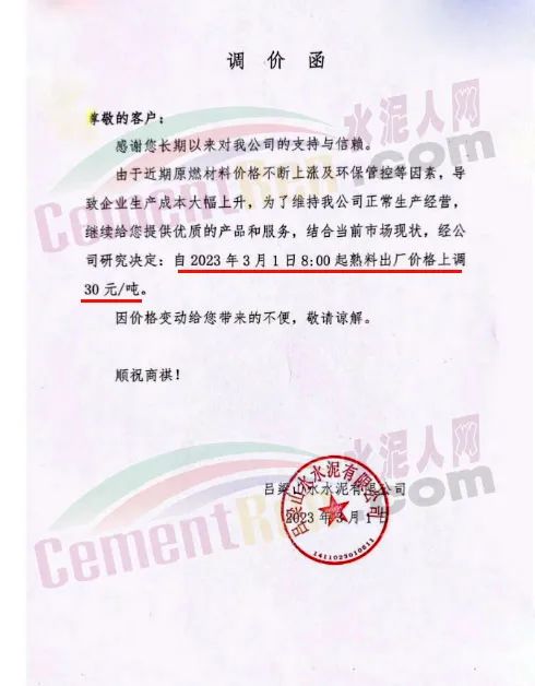呂梁山水水泥通知,由于近期原燃材料價格不斷上漲及環保管控等因素,導致企業生產成本大幅上升,為了維持公司正常生產經營,結合當前市場現狀,經公司研究決定,自2023年3月1日8時起熟料出廠價格上調30元/噸。